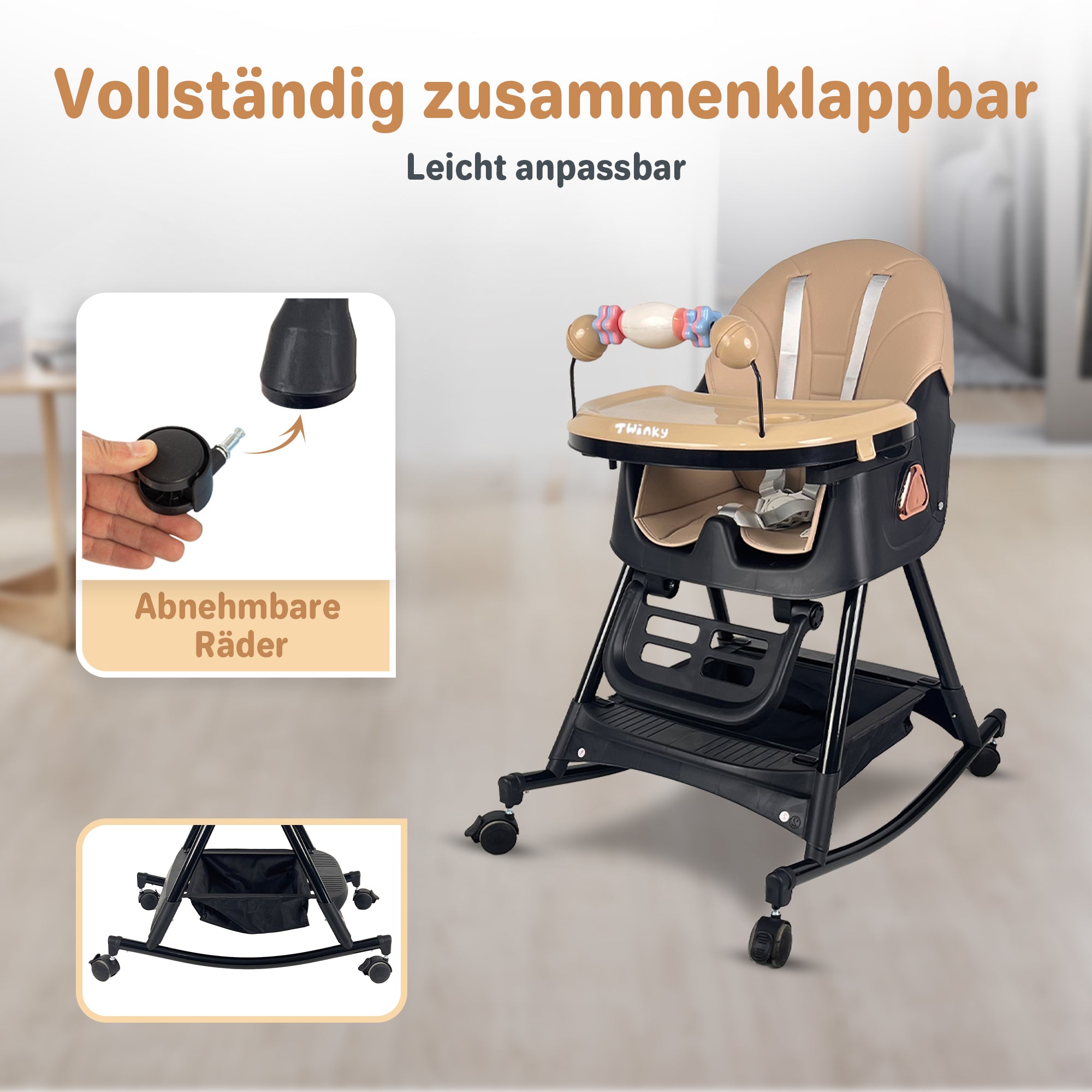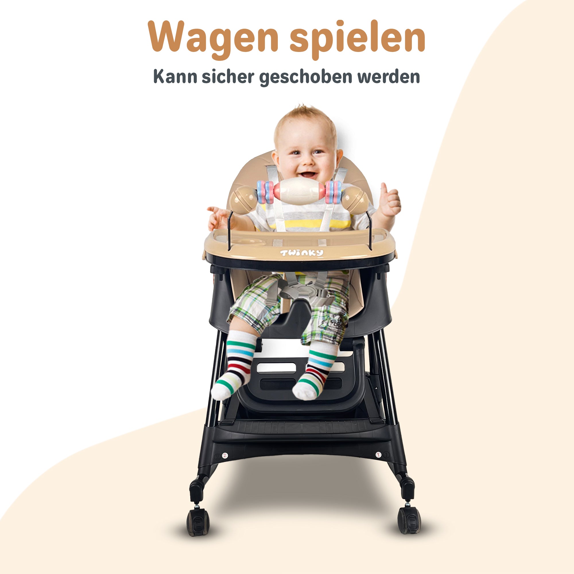 Dieser clevere Must-have ist nicht einfach nur ein Kinderstuhl. Er ist ein Essstuhl, Spielwagen und Schaukel in einem. Perfekt für vielbeschäftigte Familien, die Komfort, Sicherheit und Spielspaß kombinieren möchten.