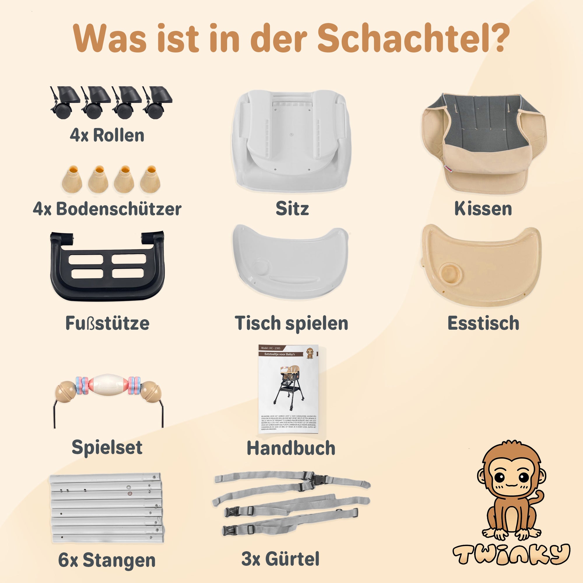 4 Rollen · 4 Bodenschutzvorrichtungen · 1 Sitz · 1 Spieltisch · 1 Esstisch · 1 Spielset · 6 Pfosten · 3 Gurte · Bedienungsanleitung