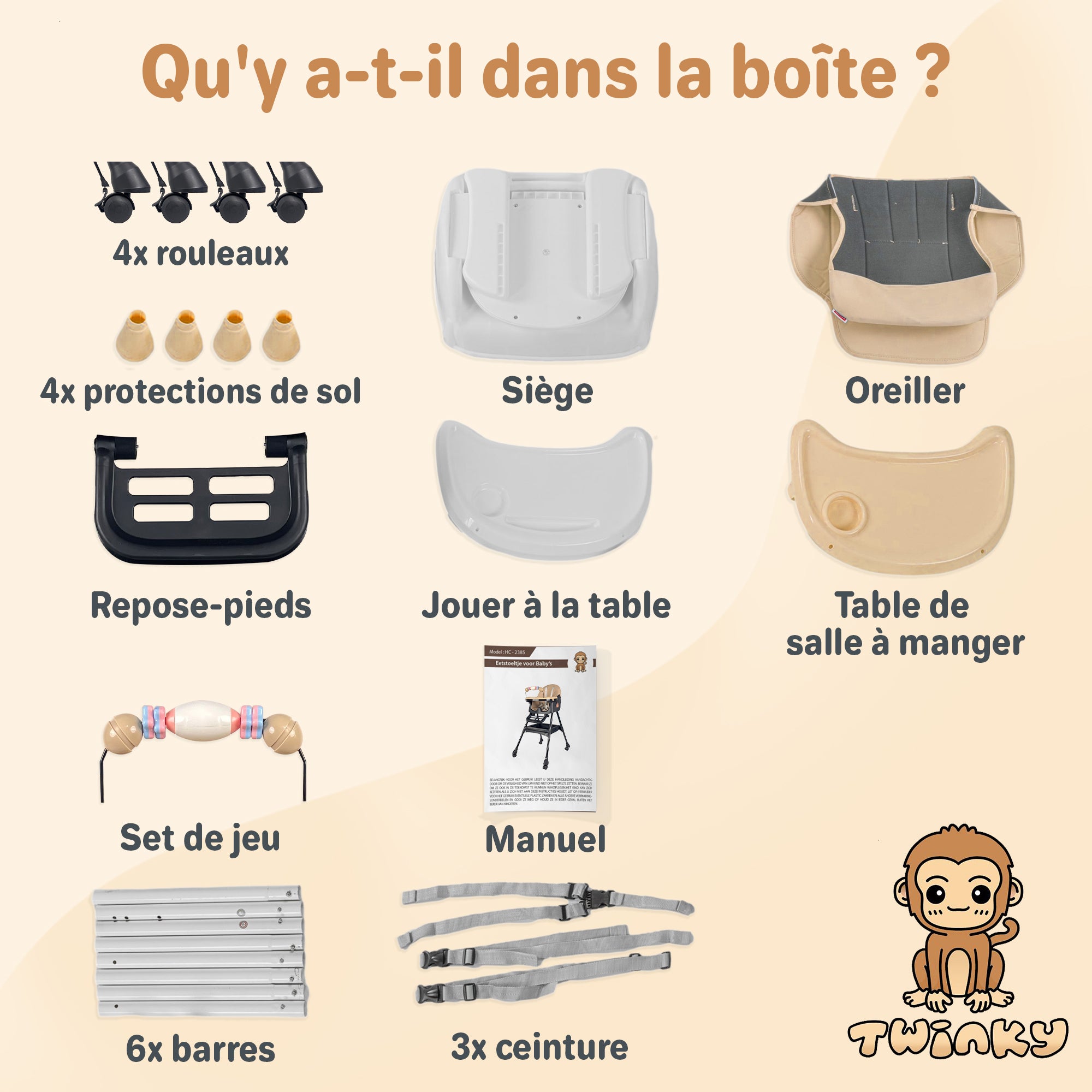 4 roulettes · 4 protections de sol · 1 siège · 1 table de jeu · 1 table à manger · 1 ensemble de jeu · 6 poteaux · 3 sangles · manuel